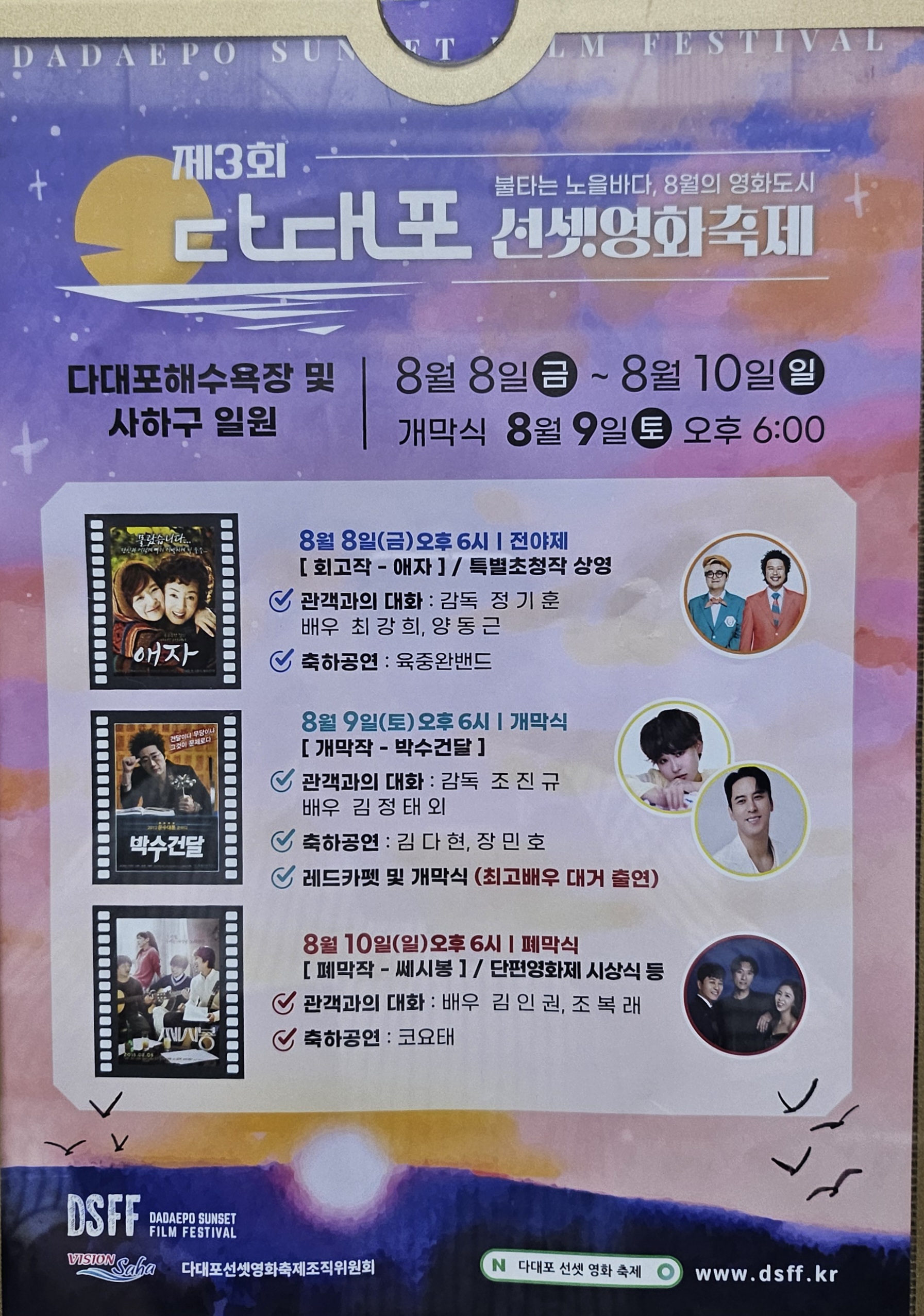 2025년 제3회를 맞이한 이번 축제는 다대포 선샤인 축제의 연장선으로, 일몰과 함께 시작되는 야외 상영으로 감성을 자극합니다.