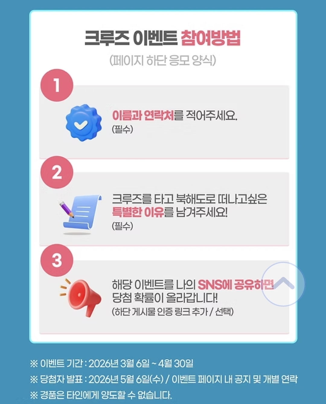 - 참여자 전원 혜택: 이벤트 신청자 모두에게 크루즈 이용 시 최대 30만원 할인권 증정